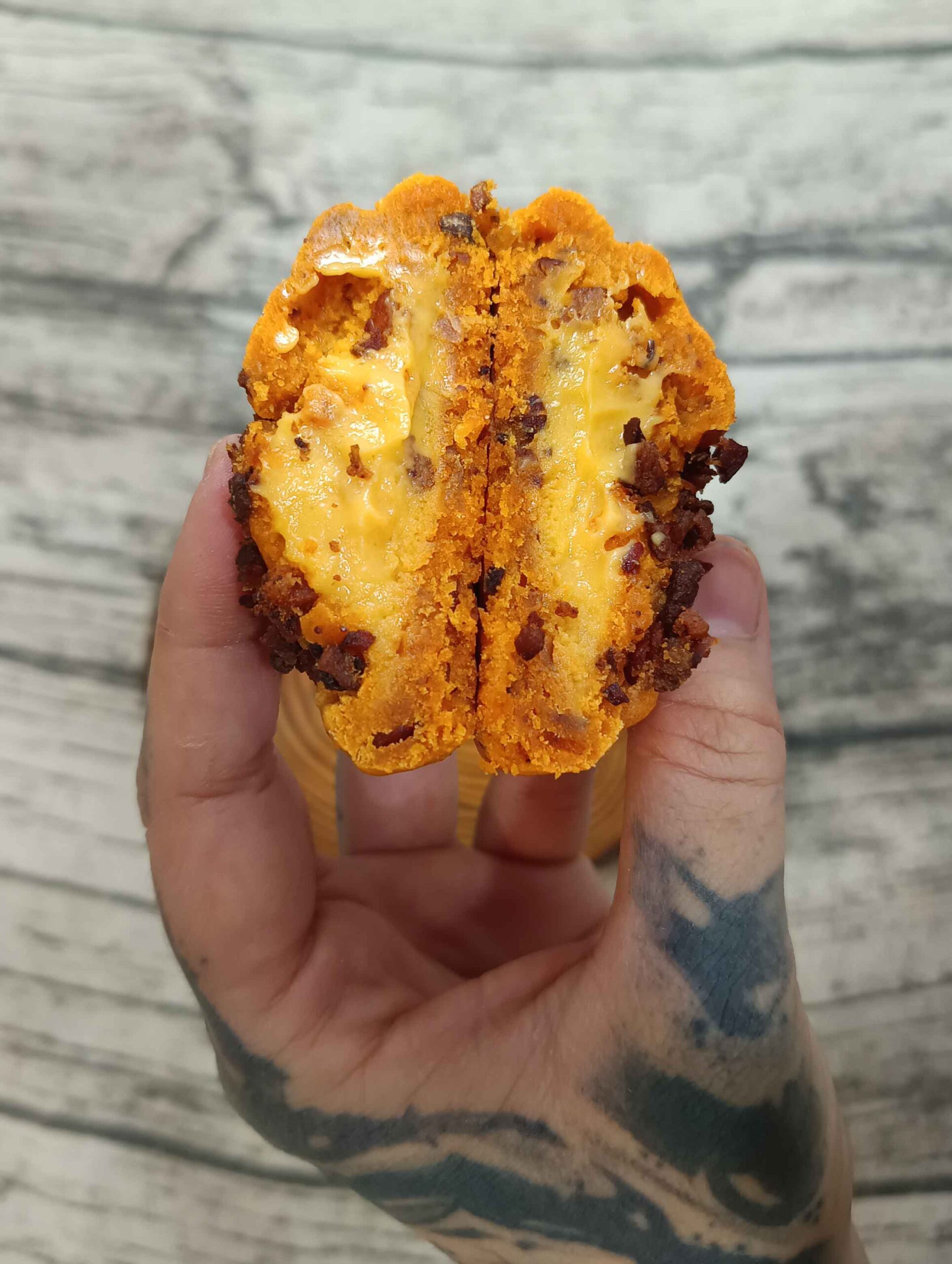 La Forja de Erebor combina el sabor intenso del cheddar fundido con la dulzura justa de una masa salada y crujiente, entrelazada con la intensidad de la mermelada de bacon. Su interior es un núcleo fundente de queso y bacon ahumado que es tan cálido y poderoso, como el metal recién salido del yunque.