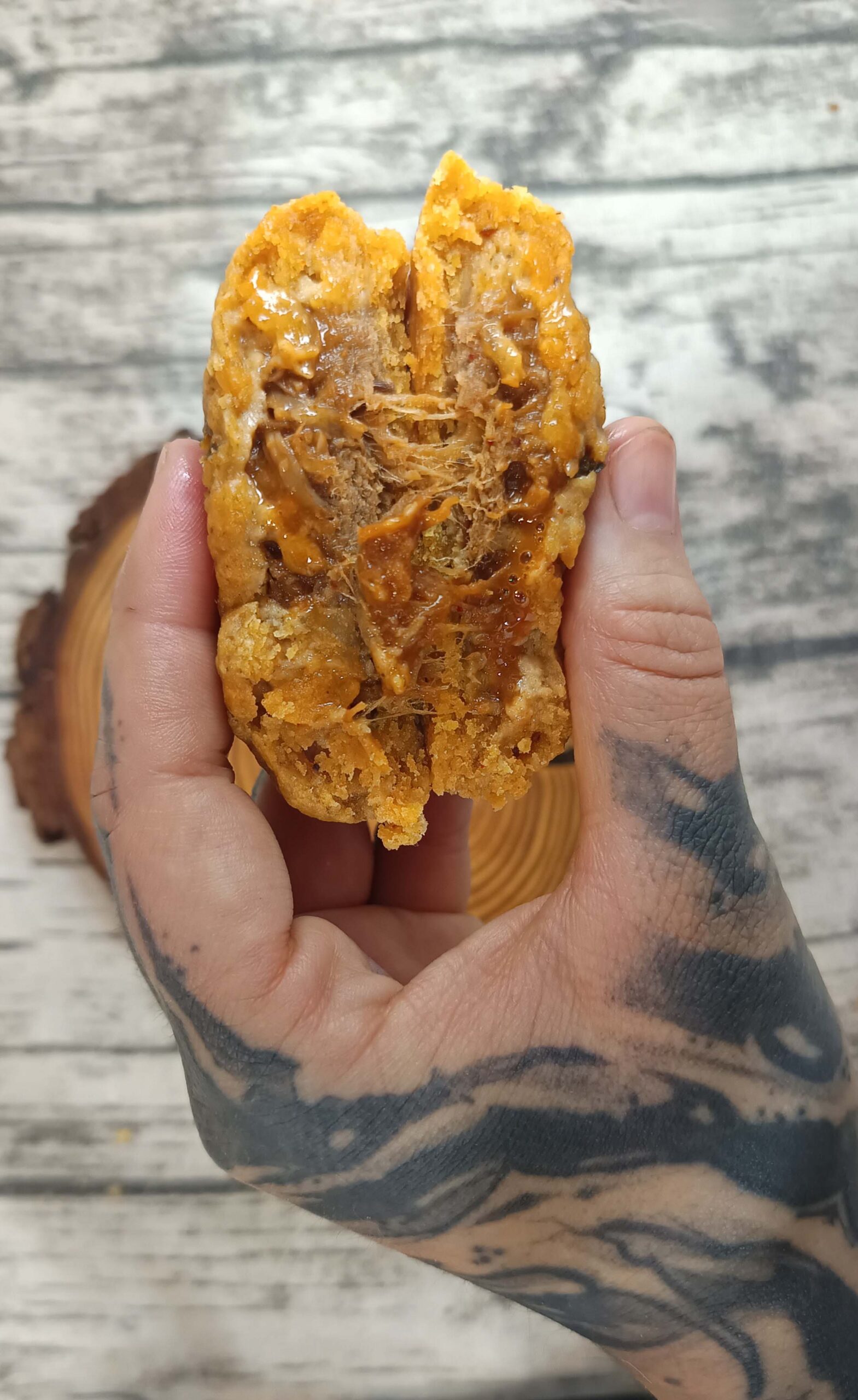 Su masa dorada y jugosa incorpora jalapeño y una mezcla de especias picantes, que despiertan el paladar sin dominarlo, mientras los pedacitos de pulled pork se funden con un núcleo jugoso de BBQ y salsa chipotle, aportando un picante profundo, ahumado y perfectamente equilibrado con el sabor del cerdo desmenuzado.
