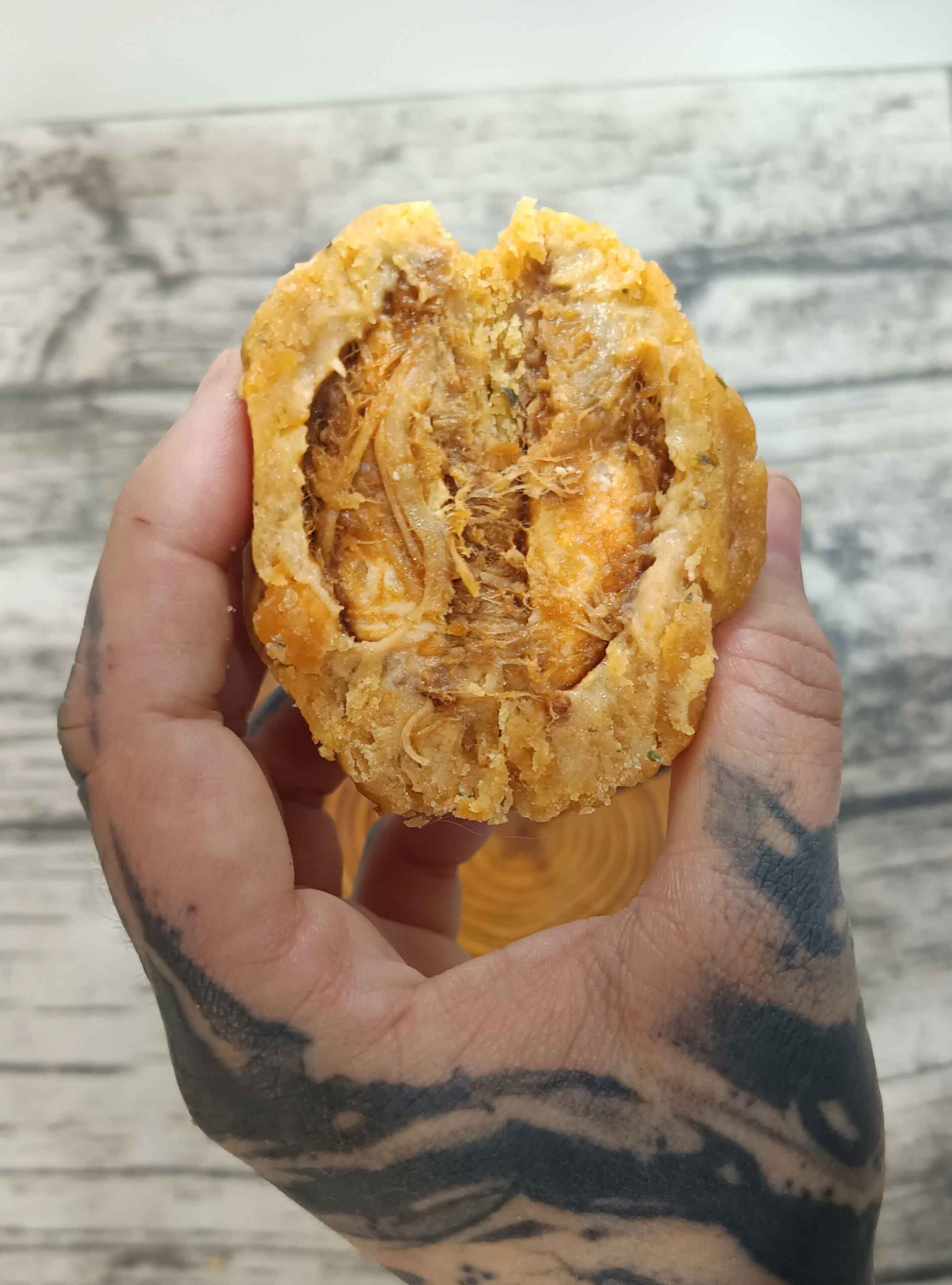 Su masa dorada y firme rodea un núcleo de pulled pork jugoso, fundido con queso cremoso, creando un equilibrio perfecto entre intensidad y suavidad. Cada mordisco recuerda a un banquete de guerreros: contundente, lleno de sabor y absolutamente satisfactorio.